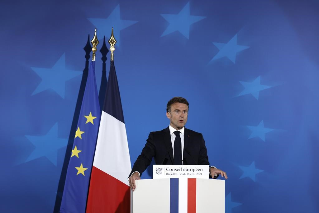 French President Emmanuel Macron speaks during a media conference at an EU summit in Brussels, Thursday, April 18, 2024. European Union leaders on Wednesday debated a new “European Competitiveness Deal” aimed at helping the 27-nation bloc close the gap with Chinese and American rivals amid fears the region’s industries will otherwise be left behind for good. (AP Photo/Omar Havana)